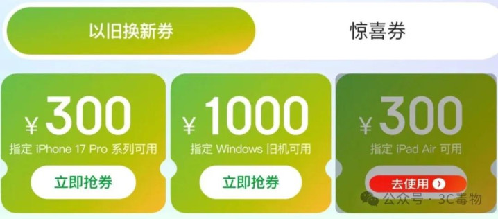 除了周年限定的大额优惠券之外,还有以旧换新券、惊喜券可以领取。