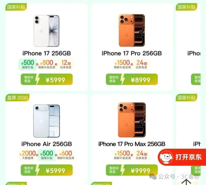 目前,苹果官方给出了国补优惠、以旧换新补贴之后的部分价格。